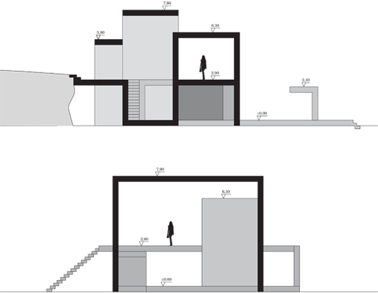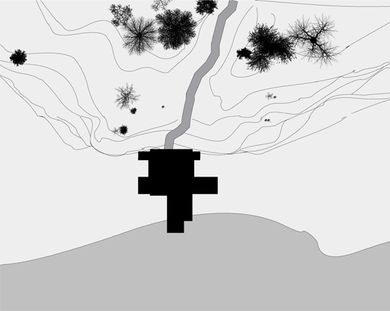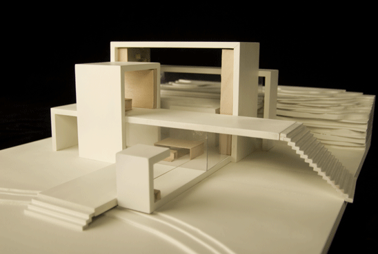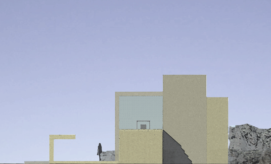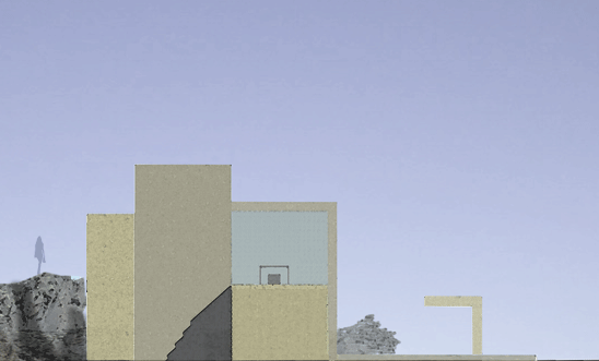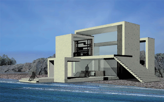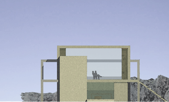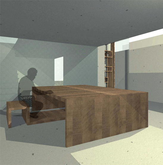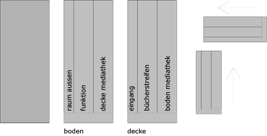 bei diesem entwurf haben wir uns mit dem thema "faltung" beschäftigt. dies sollten wir auf einem fiktiven grundstück in form einer privatbibliothek umsetzen. gegeben waren zwei stahlbetonflächen (á 250 m²), die als decke und boden dienen sollten. dabei habe ich verschiedene faltungen analysiert und auf funktionalität untersucht. entschieden habe ich mich für eine 90° faltung. dabei hab ich meine platten (10 m x 25m) in drei streifen in verschiedenen breiten angeschnitten. anschließend ordnete ich die platten auf dem boden und in 3m höhe auf den felsen an und ließ sie auf einander zugehen. dabei faltete ich meine abgeschnittenen streifen um 90° und erzeugte dadurch meine räume. die unten angesetzte platte wird zur decke und aus oben angesetzten platte entsteht der boden.