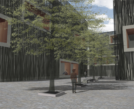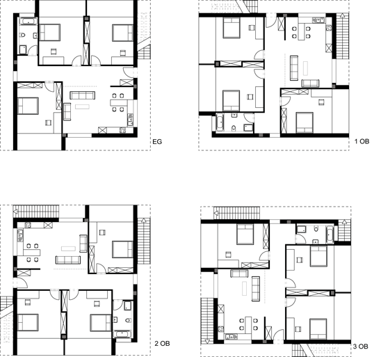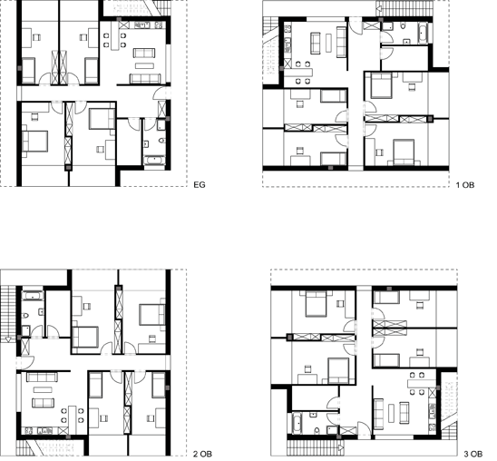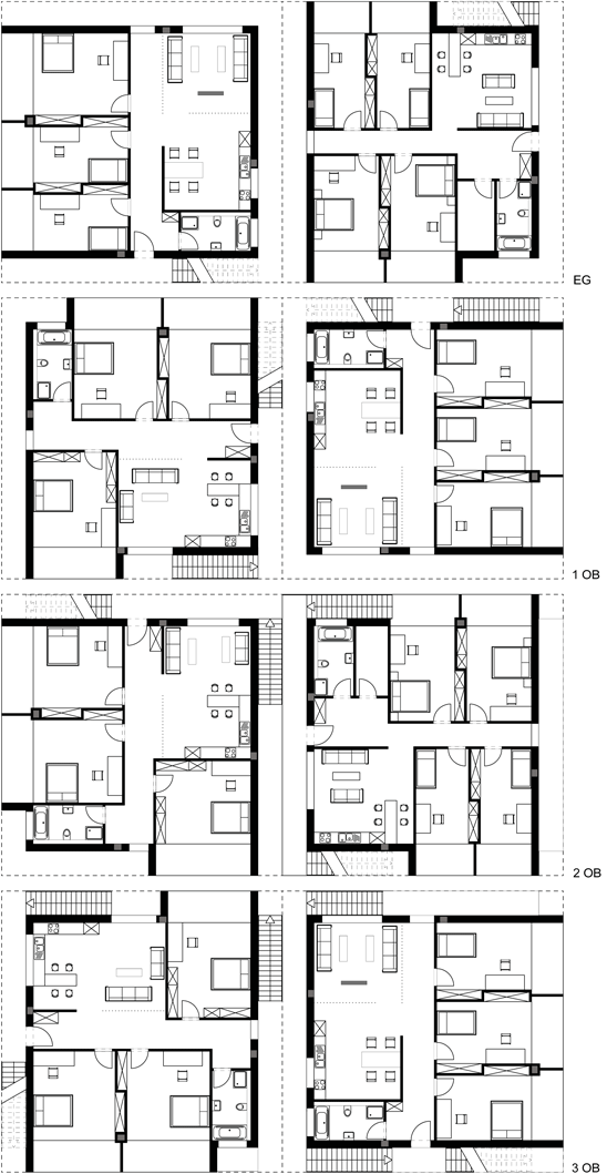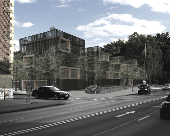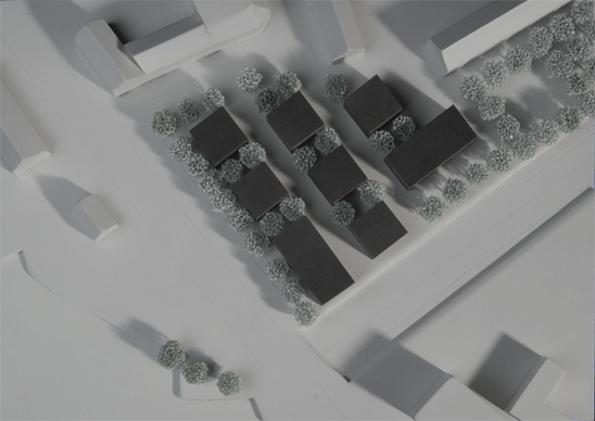 das wohnquartier soll den steigenden studentischen wohnbedarf in zentrumsnähe entlasten. die grundrisse sind für das wohnen in gemeinschaften von 3 bzw. 4 parteien ausgelegt. die viergeschossigen kuben werden spiralförmig über außentreppen erschlossen. für die unterbringung von fahrzeugen befindet sich eine tiefgarage auf erdbodenniveau .