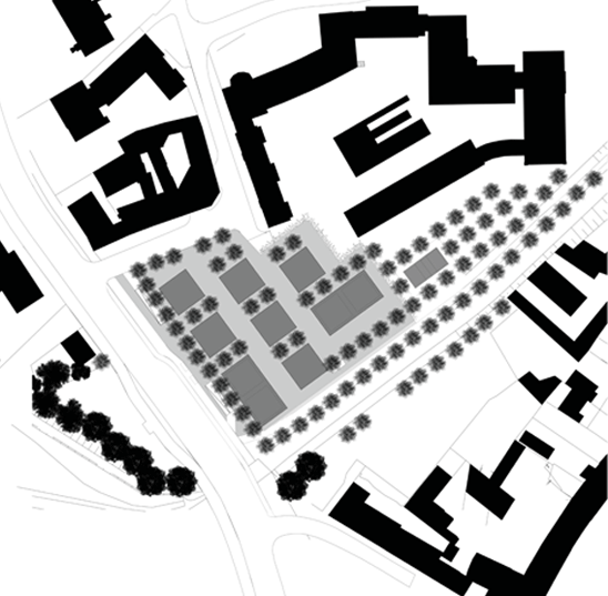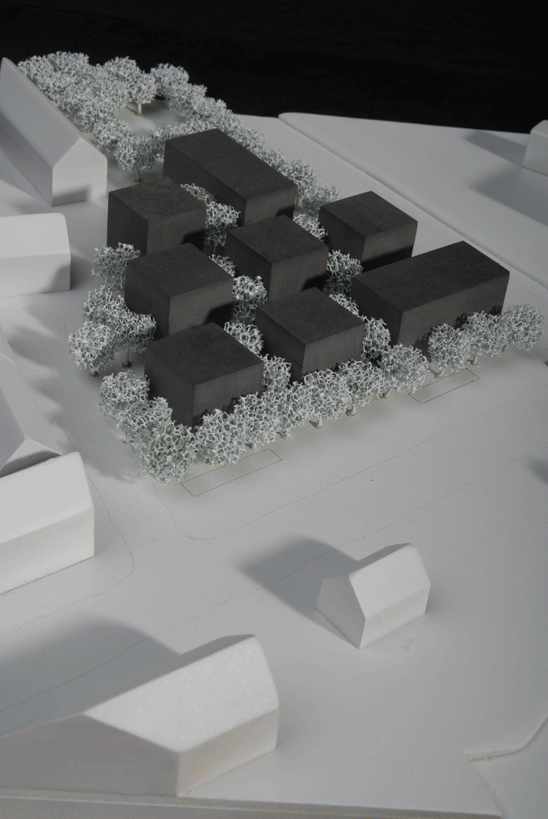 mein entwurf sieht eine einfache kubenhafte strukturierung des grundstücks am stadtgraben in münster vor. die enge zusammenstellung einzelner quadratförmiger wohneinheiten erzeugt engere und weitere platzartige zwischenräume. sie dienen als aufenthalts- und kommunikationsmöglichkeiten zwischen den bewohnern, aber auch als abgrenzung zu den unterschiedlichen privatzonen der wohngemeinschaften. die umliegende grünzone setzt sich in der wohnstruktur fort.