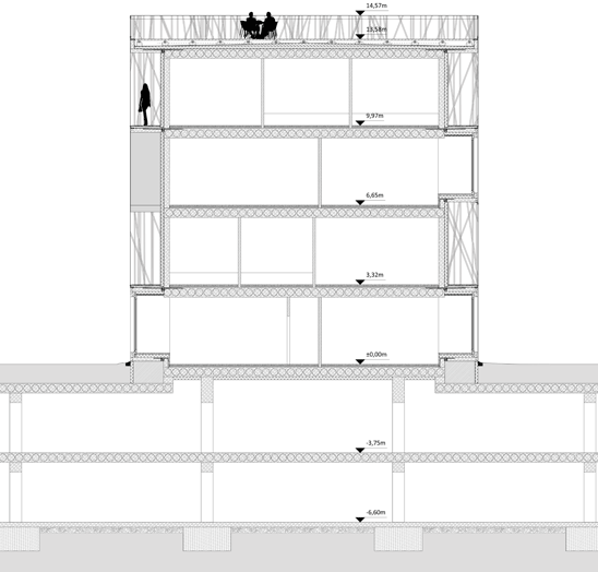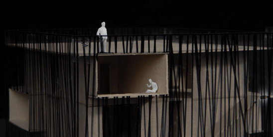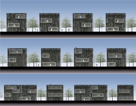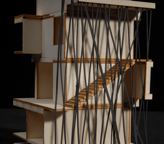 die kuben werden mit einem unorthogonalen stahlgeflecht umschlossen. sich öffnende wohnräume durchstoßen die struktur, introvertiertere räume bleiben versteckt.